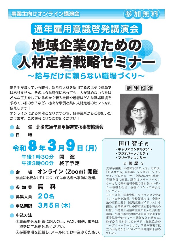 事業主向けと題していますが、雇用者を含めどなたでも参加可能です。申込みをお待ちしています。
