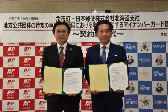 マイナンバーカードの手続き環境を整備し、町民の利便性向上を図るため、余市町と日本郵便株式会社北海道支社との間で一部事務の委託契約を締結することとなり、さる9月11日に、本庁において日本郵便株式会社北海道支社長の坂東秀樹様をお招きし、契約締結式を執り行いました。